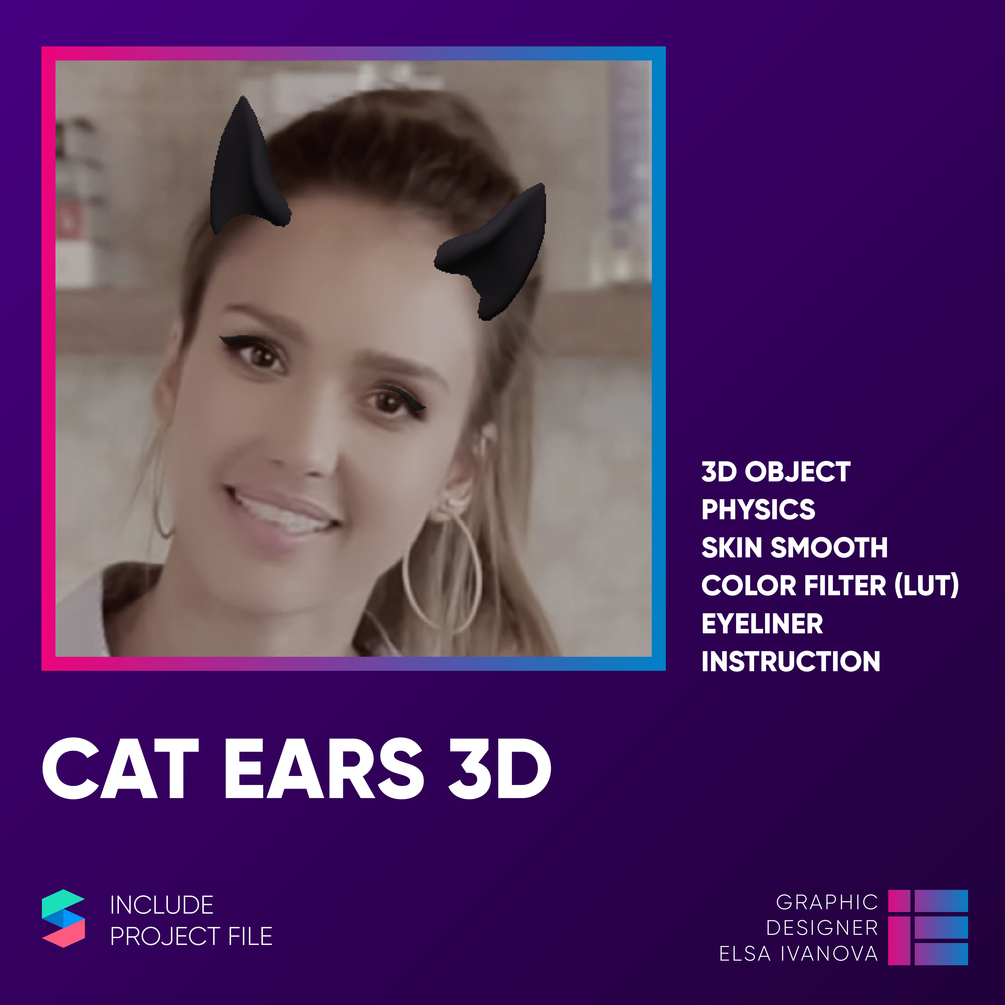 Это готовый проект (созданный в SparkAR'105), на его основе вы можете создать свой собственный фильтр, поменять цвет ушей. Всего лишь нужно открыть проект и продолжить создание!